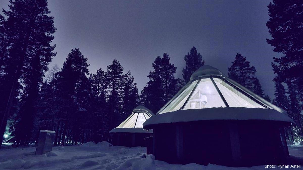 Igloo huts with glass roof and a bed under the glass ceiling. Double bed, own toilet and shower, water heater, microwave, small fridge, some space for luggage. Some igloos can accommodate 3 persons (double bed + extra sofa bed). Shared sauna and the ice-hole for an arctic swim available. Private sauna use can be booked.